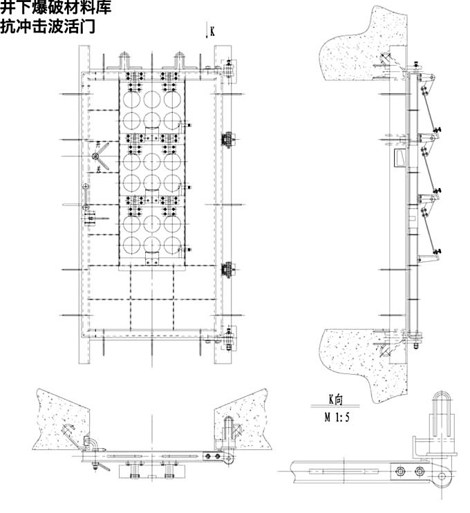 1、本件炸藥庫抗沖擊波活門,抗沖擊波超壓能力為2500kpa,通風活門組分為三組,總通風量為6000m3/h,每組通風量為2000m3/h,風速均按8m/s進行設計的。使用時可根據(jù)井下爆破材料庫需要風量和總回風道負壓值,確定通風活門組數(shù),并可調(diào)節(jié)每組活門懸板的張啟角度進行微調(diào),以滿足***佳通風量。