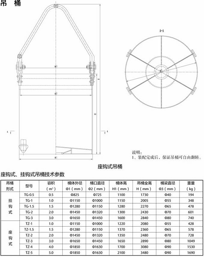 吊桶是立井井筒開鑿期間提升矸石、升降人員和材料的主要容器。當井筒涌水量小于6m3/h時,還可作排水用,根據卸矸形式不同吊桶分為掛鉤式吊座鉤式吊桶。